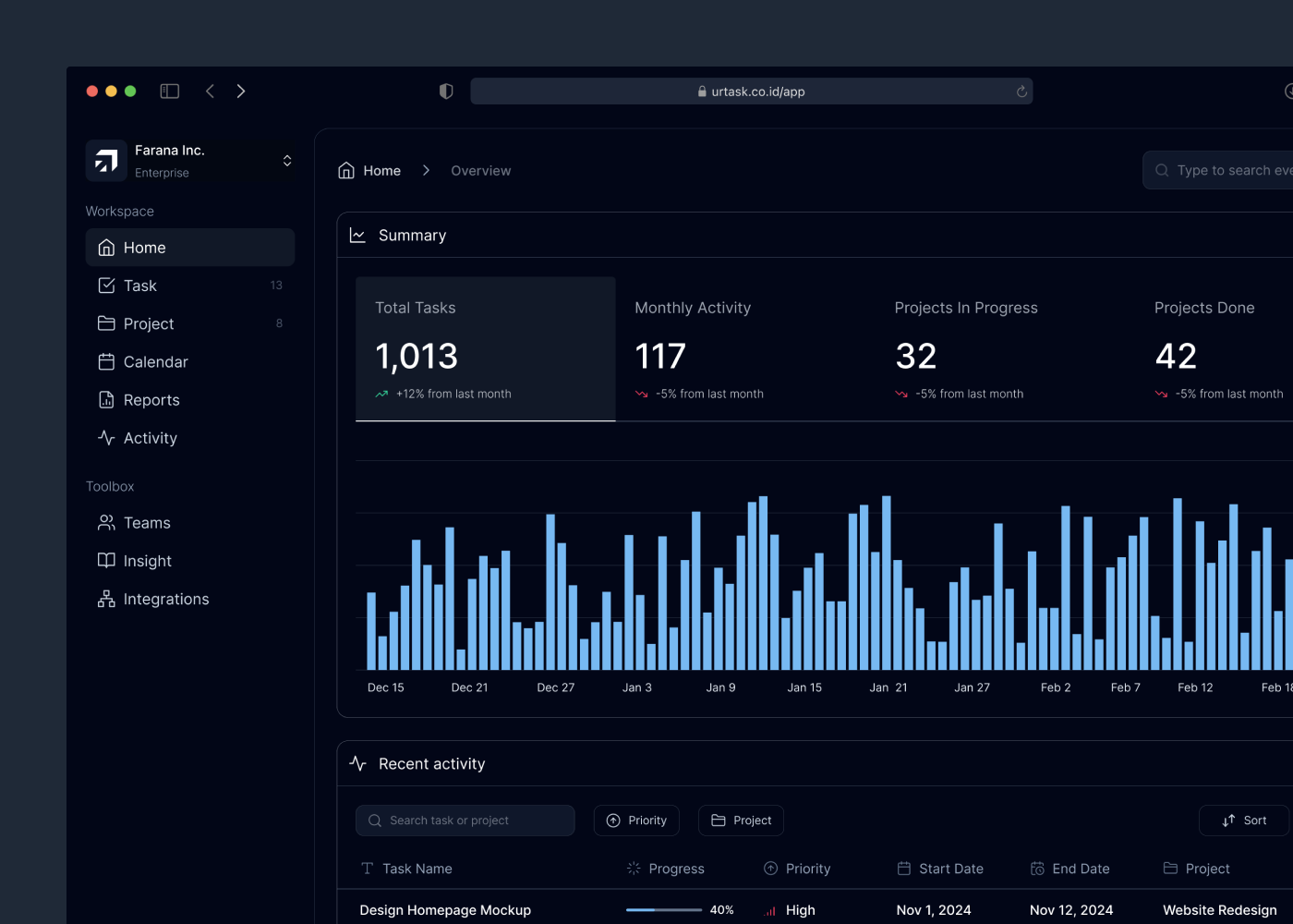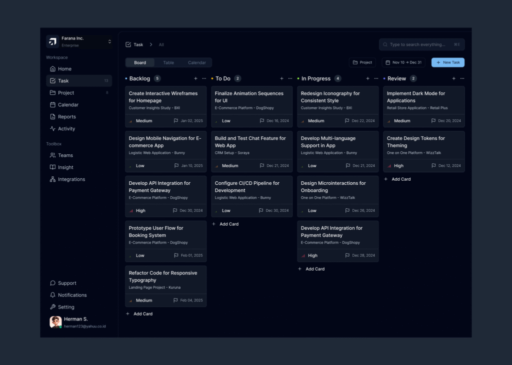The task management platform I designed aims to simplify complex workflows and enhance productivity for users at all levels. From the dashboard that provides quick, essential insights at a glance, to the clean and intuitive calendar that helps users stay organized, every element has been crafted with clarity and usability in mind. The activity tracking system ensures transparency and empowers users to monitor progress and make real-time improvements, while the task page offers flexible views like Kanban boards to suit diverse needs and foster better workflow visualization.